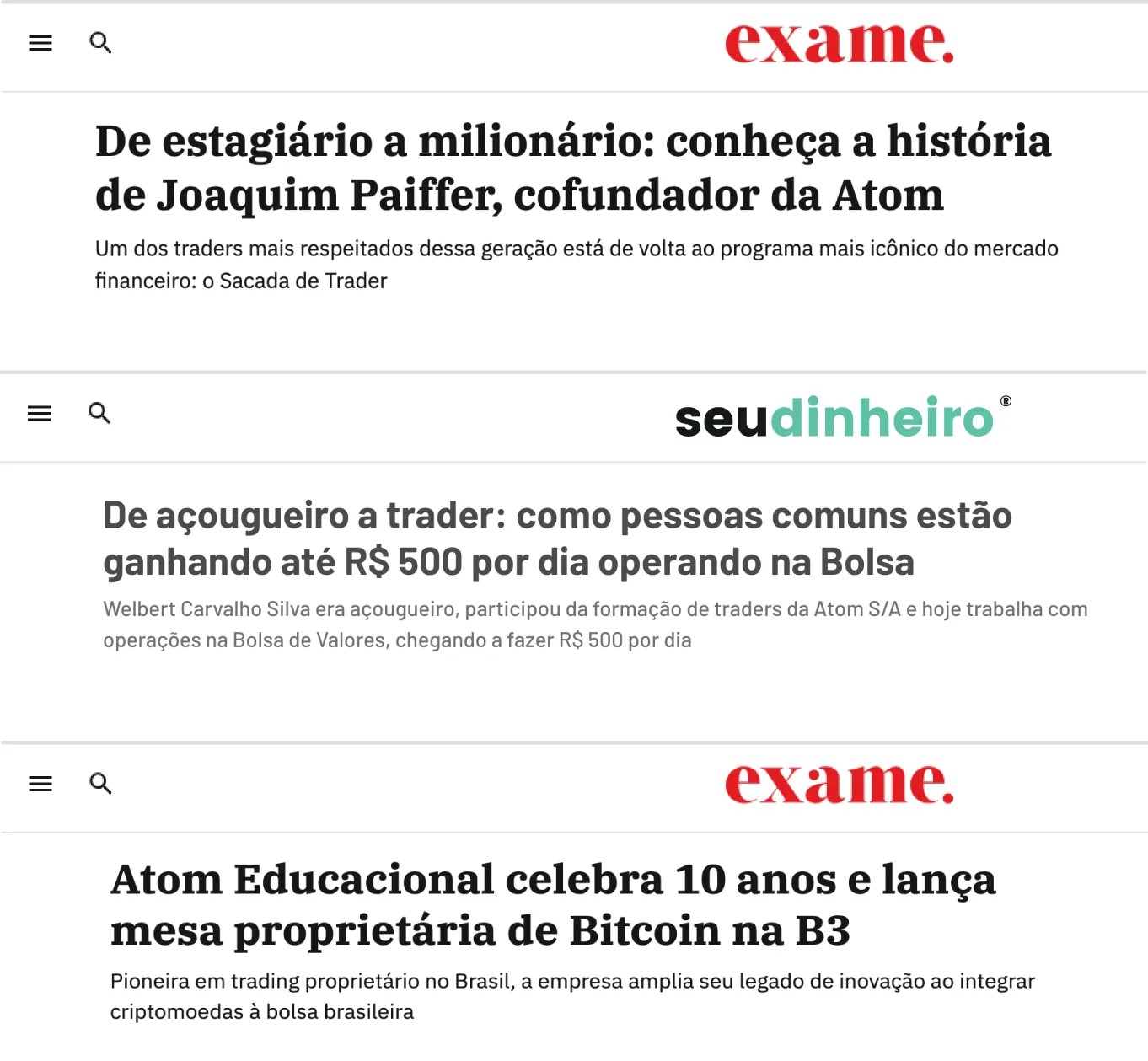 A Atom S.A. não presta serviços de intermediação de operações com valores mobiliários e não está autorizada pela Comissão de Valores Mobiliários a prestar tais serviços. Os cursos e materiais didáticos fornecidos pela Atom têm por finalidade ensinar técnicas para realização de operações no mercado de bolsa, não sendo possível assegurar que o adquirente de tais produtos obterá ganhos em suas operações.
